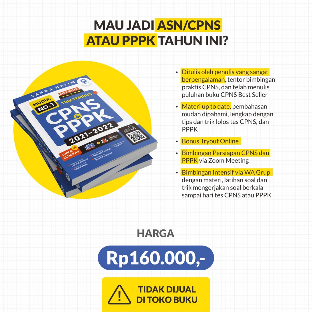 - Produk ini tidak sedang Flash Sale, tidak semua Seller suka Flash Sale, saya rasa ini bukan kekurangan, Jika Anda anggap Harga Rp. 160.000,00 itu murah untuk Modul No 1 Trik Tembus CPNS & PPPK 2021-2022 - Sahda Halim ya ambil saja